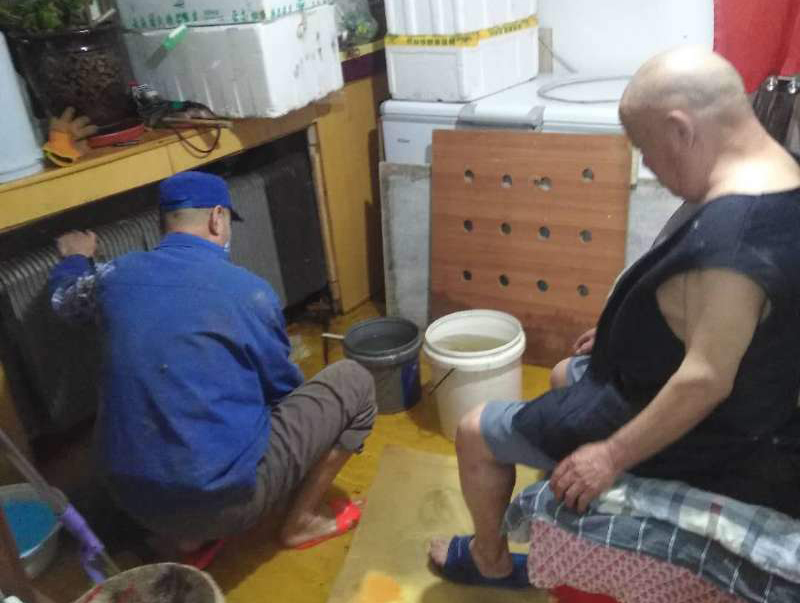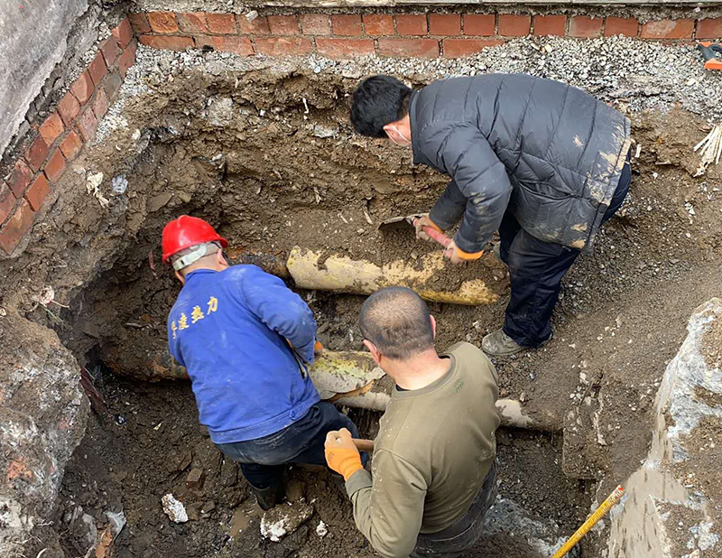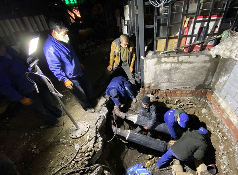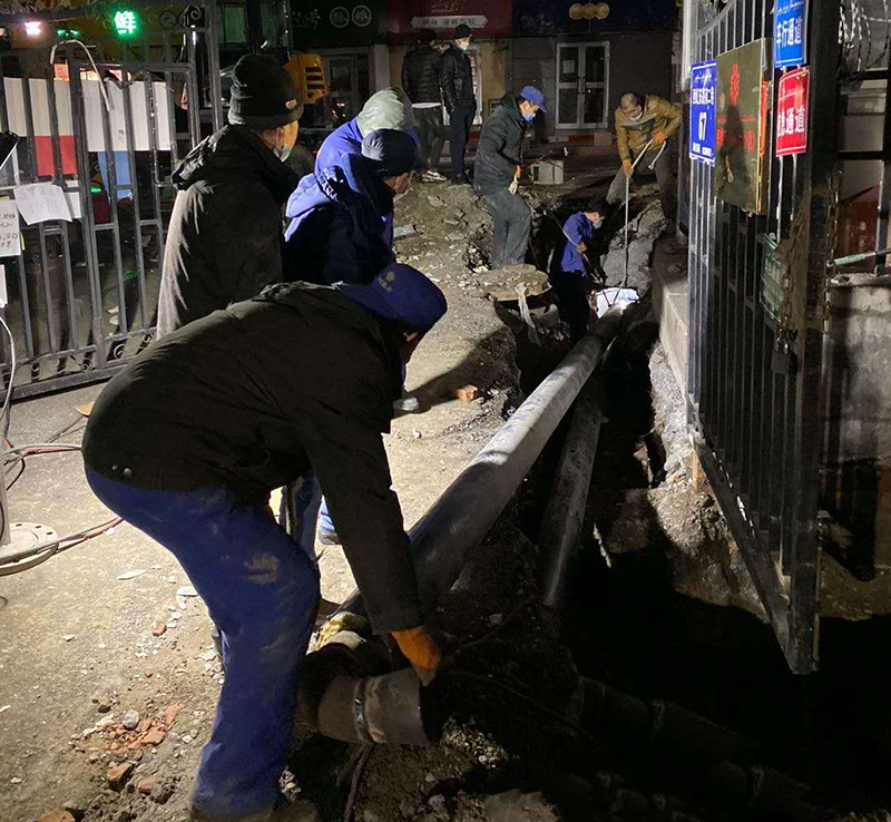 抢修当晚,室外气温降至零下5度。由于供、回水管部分未保温造成管线腐蚀漏水,管线漏水点在小区大门口立柱下方且管线上有社区岗亭,给抢修带来极大困难。经过现场勘查后,又重新制定方案:原管线废除,重新铺设2根管线,增加弯头13个,焊口30余道。