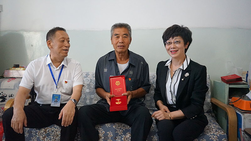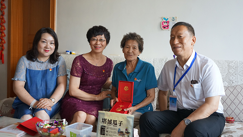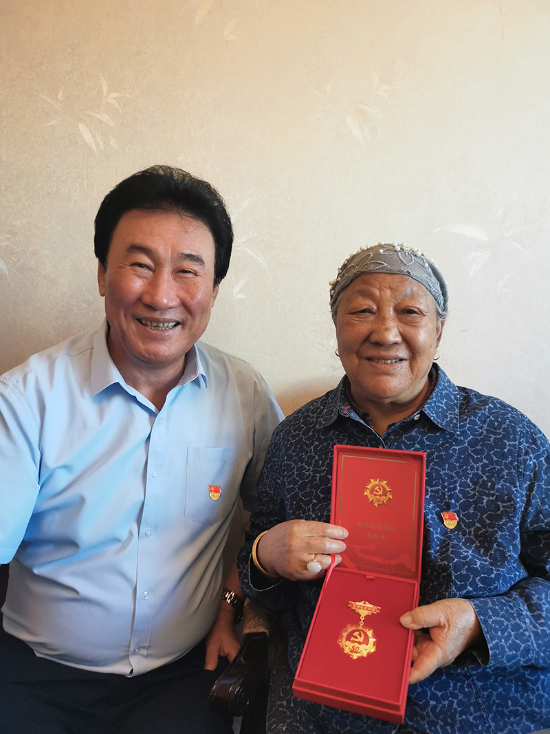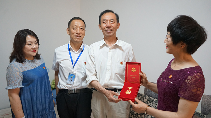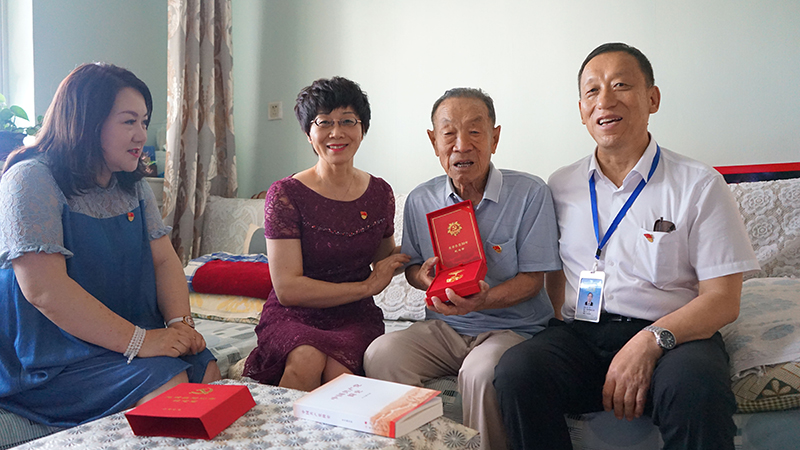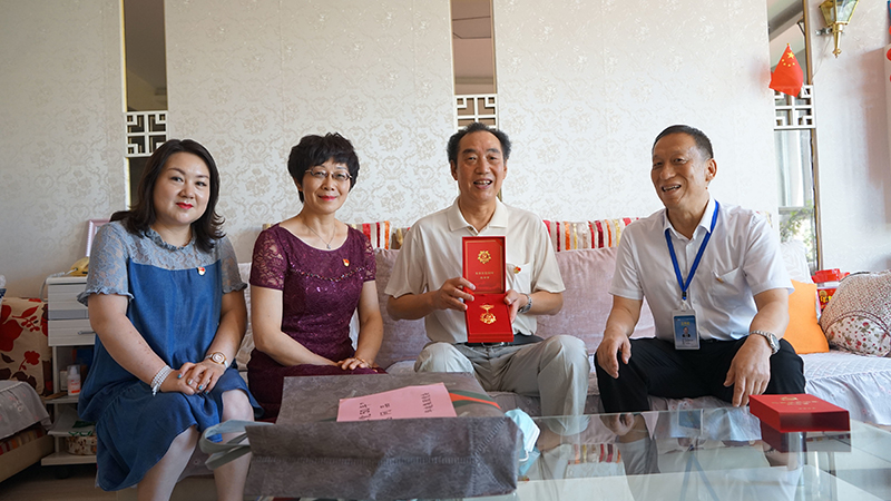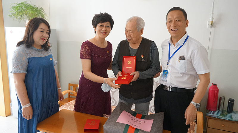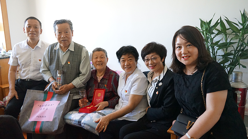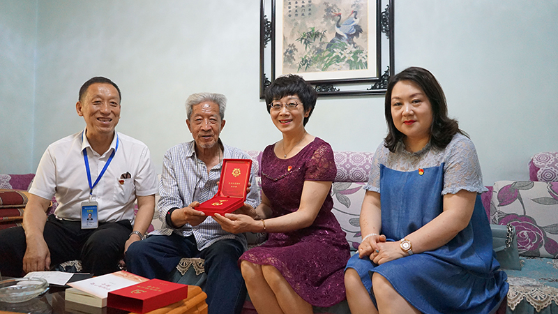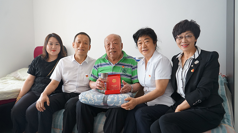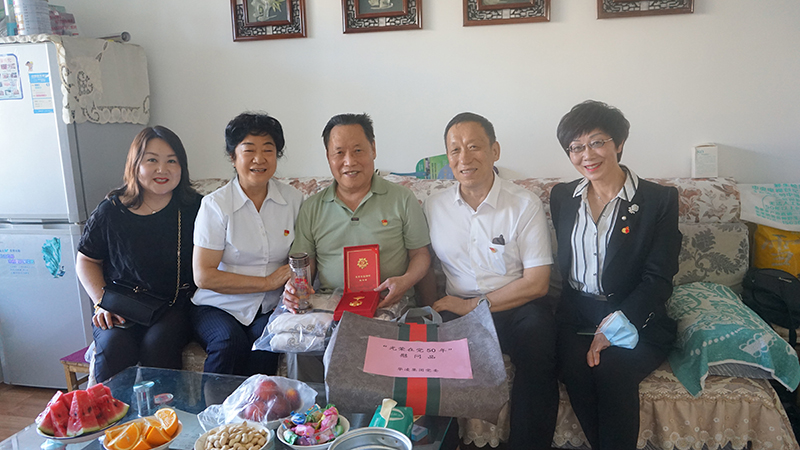 集团党办、工会、退管办负责人为老党员张淑琴颁发光荣在党50年纪念章